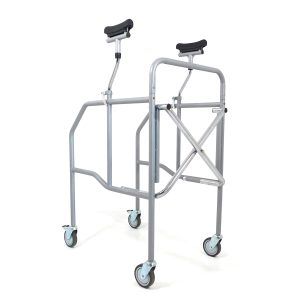 Deambulatore ascellare costruito in acciaio robusto, ha un telaio pieghevole, è dotato di 4 ruote piroettanti con freni posteriori per sicurezza. I supporti ascellari imbottiti, regolabili in altezza si adattano a diverse corporature.